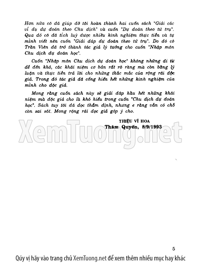 Sách "Nhập Môn Chu Dịch Dự Đoán Học" do đại sư dịch học Thiệu Vĩ Hoa thẩm định và Trần Viên biên soạn là được coi là cuốn sách mong đợi nhất về "Chu dịch", bởi cuốn sách viết theo lối diễn giải, dễ hiểu, đi từ dễ đến khó, các khái niệm đều được tác giả dẫn chứng và đi vào thực tiễn giúp bạn đọc hiểu rõ bản chất của chu dịch, áp dụng nó trong việc dự đoán tương lai.