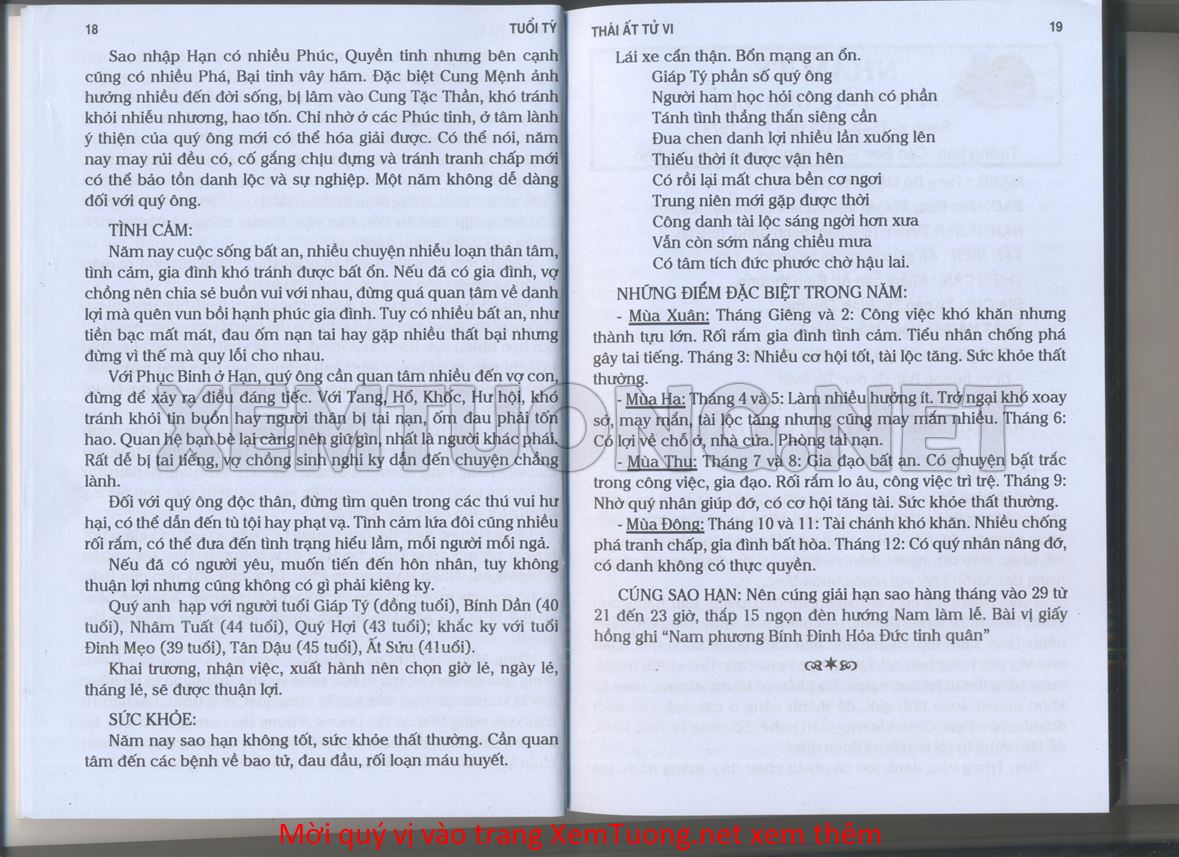(Lưu ý: Thái Ất Tử Vi được chúng tôi scan từ sách, do đó mỗi tuổi sẽ có nhiều trang, quý vị xem xong hãy nhấn vào trang tiếp theo để xem hết phần tuổi muốn xem. Nếu quý vị xem bằng điện thoại thì hãy kéo qua lại để xem phần bị khuất.)