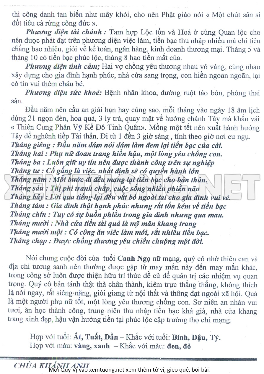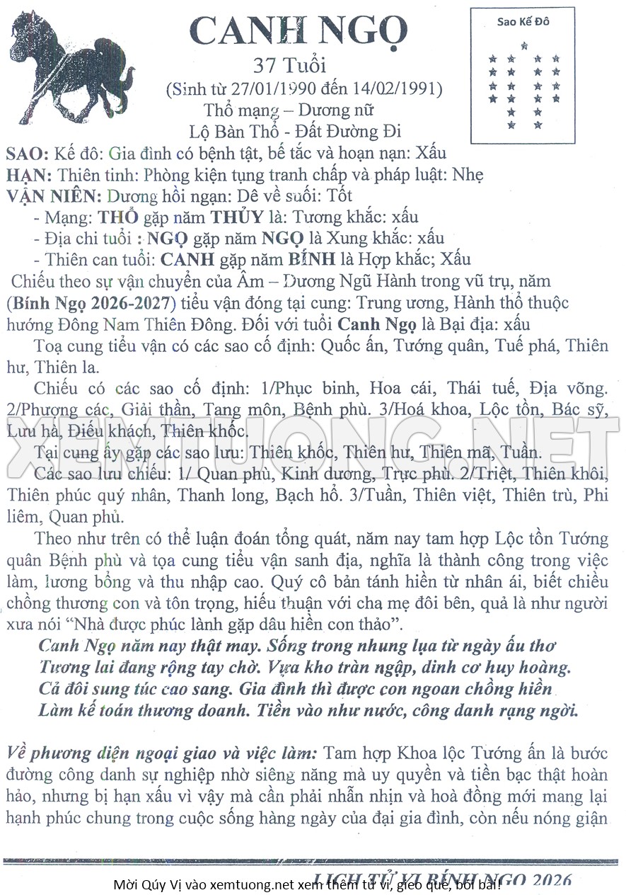 Tử Vi Năm Bính Ngọ 2026 mạng nữ CANH NGỌ
